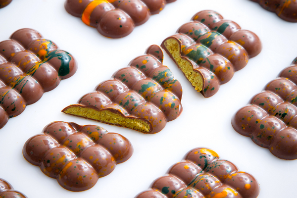 A delicious milk chocolate tablet filled with a pistachio crunch and pistachio chocolate blend.