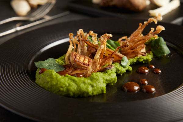 Try this delightful trio of mushrooms; including king oyster mushroom 'scallops' and crispy enoki mushrooms, served alongside a mushroom and soy gel.
