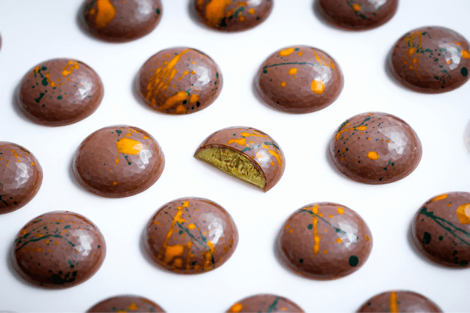 IngredientsGreen coloured cocoa butter, as desired Yellow coloured cocoa butter, as desired Milk chocolate, as desired | MethodIn a polycarbonate mould refrigerated at 18°C, make splashes of green and yellow cocoa butter using a brush, clean the excess and let it pre-crystallise. Temper the milk chocolate at 29°C. Fill a hemisphere-shaped polycarbonate mould with the tempered chocolate. Shake the mould to remove air bubbles and invert to remove excess chocolate. Remove excess and let it crystallise. |